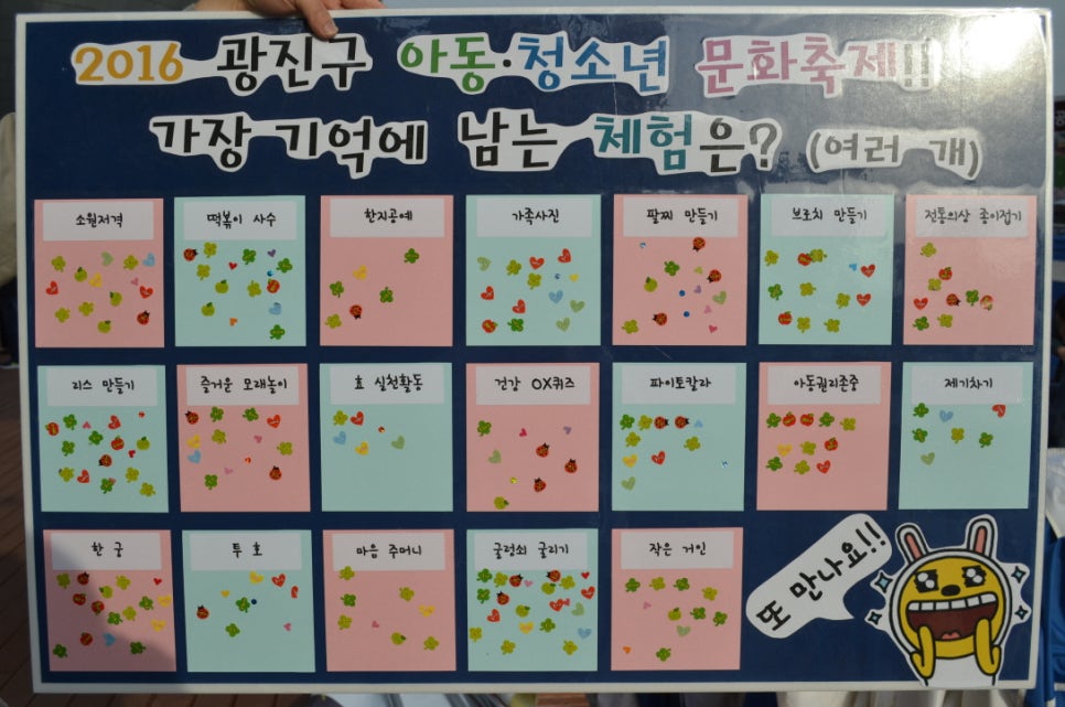 리스만들기는 아이와 부모님이 함께 즐길 수 있는 체험이었으며 욕구조사 또한 아동,청소년들의 고민을 부모님들도 함께 공유하는 유익한 시간이었습니다. 광진교육복지센터의 사후 사업진행에도 많은 도움이 될 것 으로 전망됩니다. 광진구 아동청소년 문화 축제는 올해 6회째 꾸준히 광진구 지역축제로 자리매김 해왔습니다.